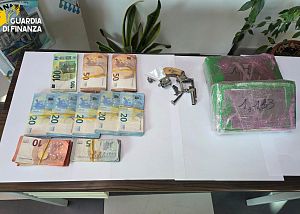 Chili di droga in auto e una pistola con matricola abrasa sono stati sequestrati dalla Finanza che ha arrestato i due uomini, uno latitante dal 2019