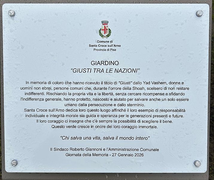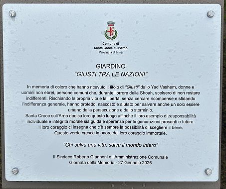 SANTA CROCE SULL'ARNO — Da oggi Santa Croce sull'Arno ha un parco intitolato ai “Giusti tra le Nazioni”, ovvero a coloro che, a rischio della propria vita, si opposero alla barbarie della Shoah per salvare anche un solo essere umano.